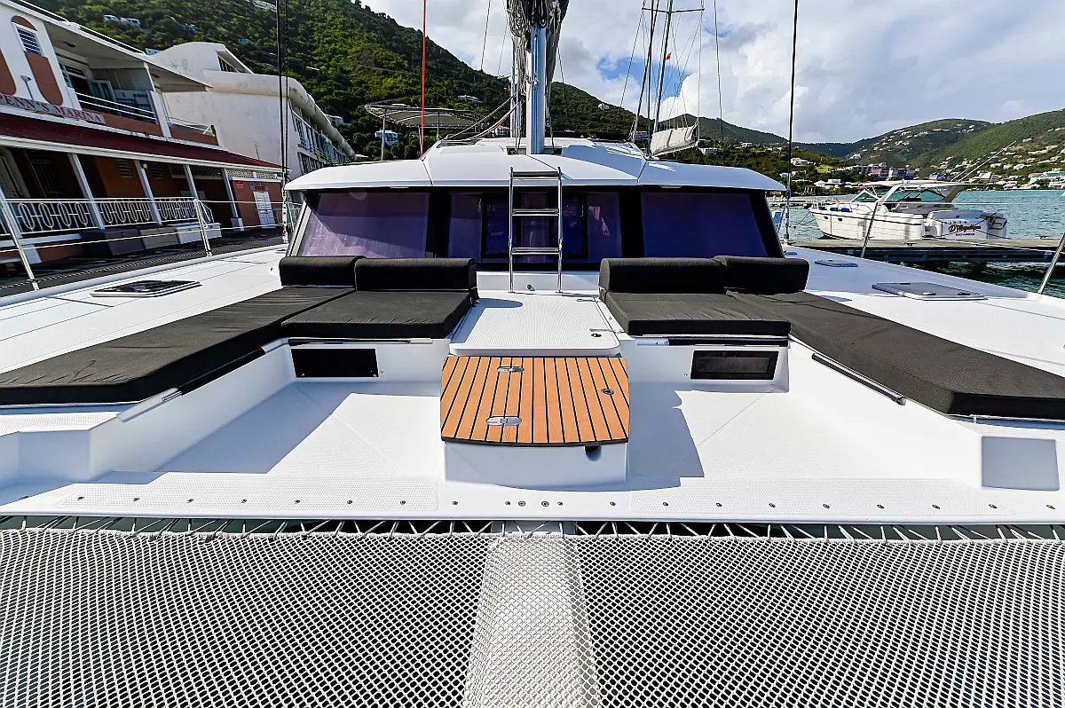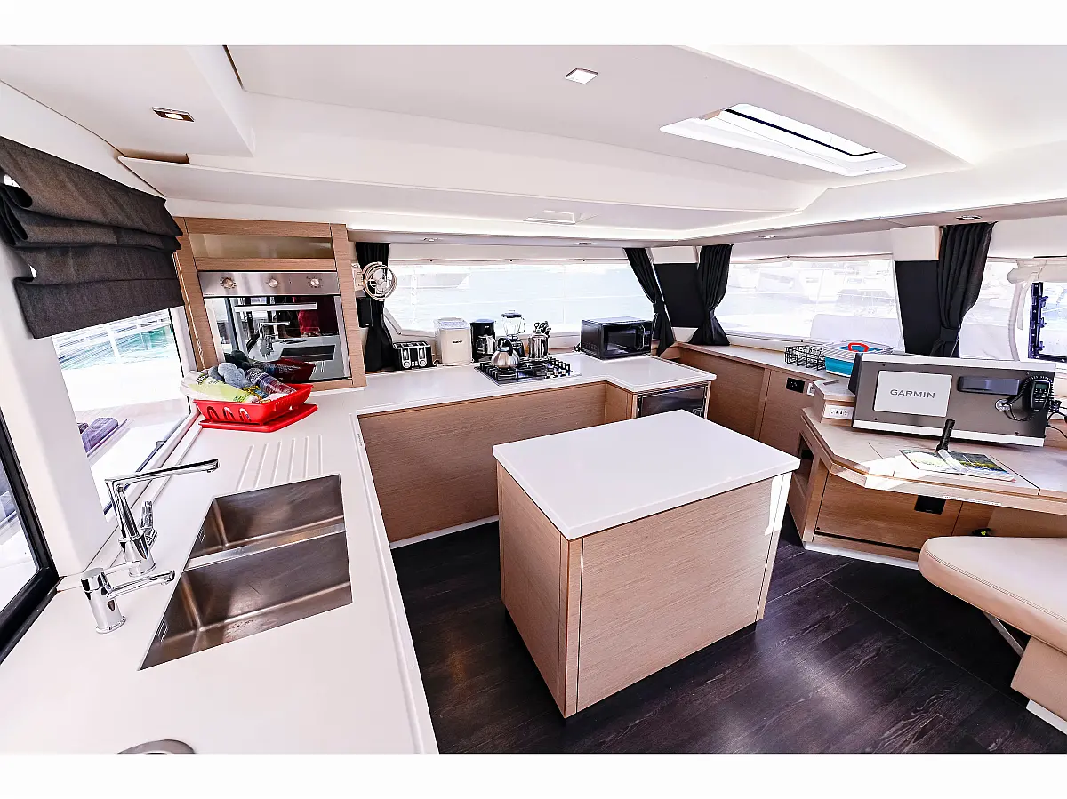 The hulls have a fine entry for speed, while fixed keels help her point to weather. Sailing is simplified with 1 electric winch, a foot switch for the windlass, and dual chart plotters & radar (one at the helm and one at the nav station). The helm features a double seat with all controls within easy reach. Winches are set forward, so sail handling never gets in the helmsman’s way. And if you’re sailing short-handed, the autopilot is your best mate.