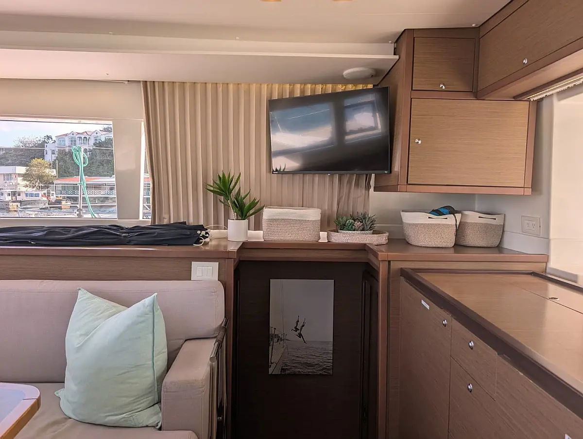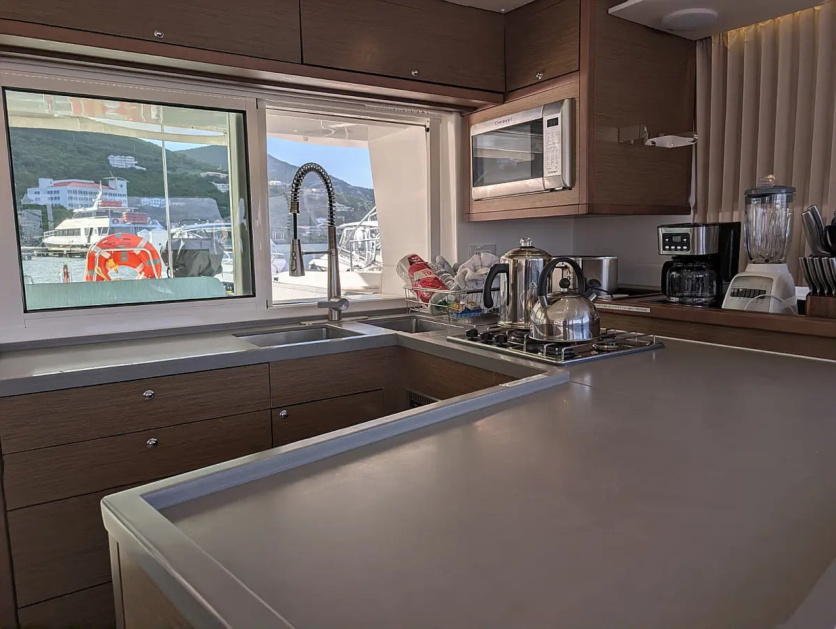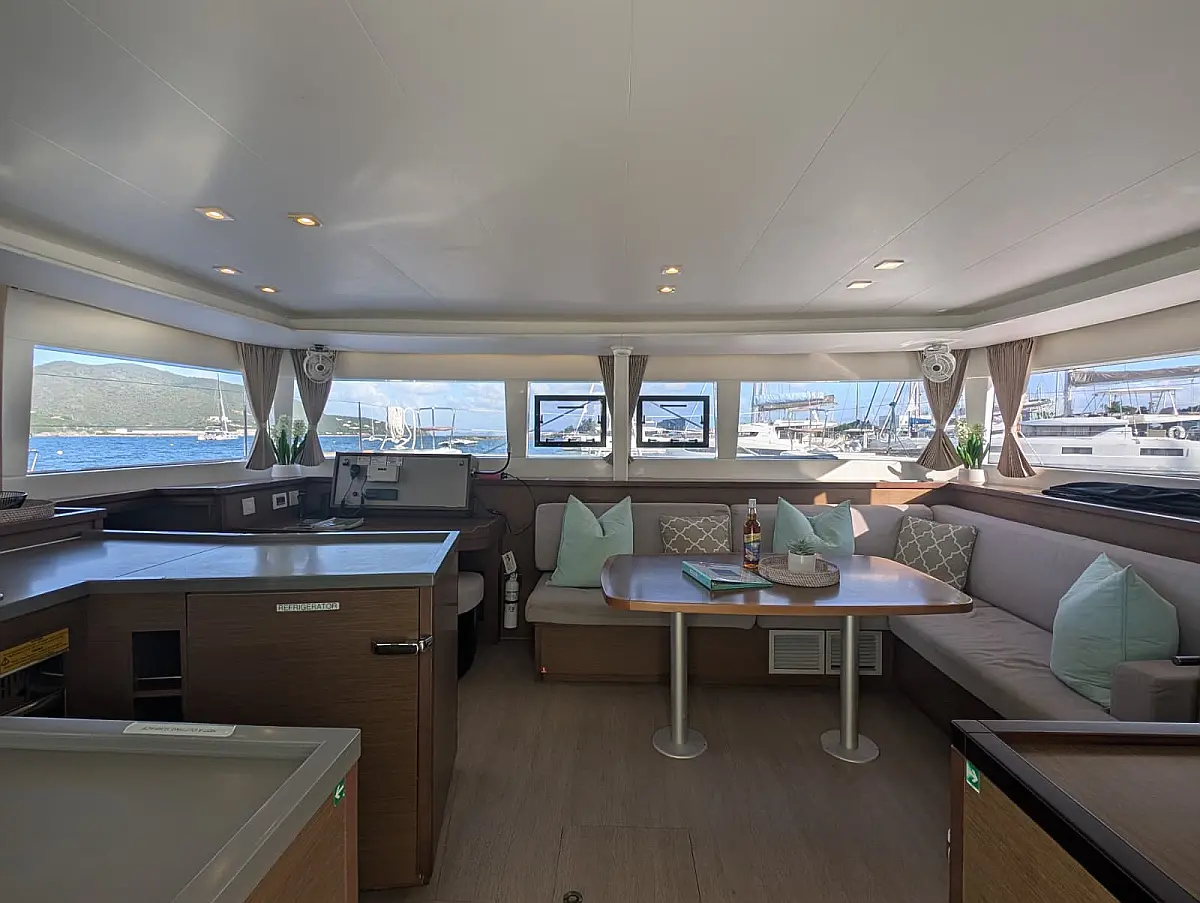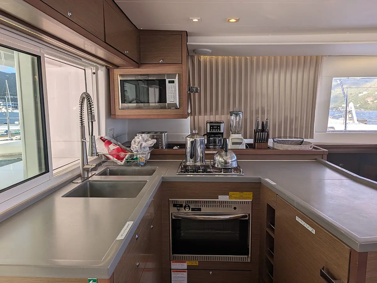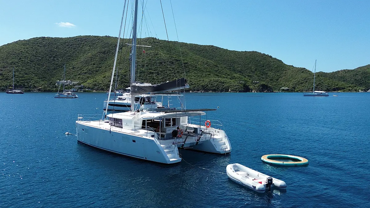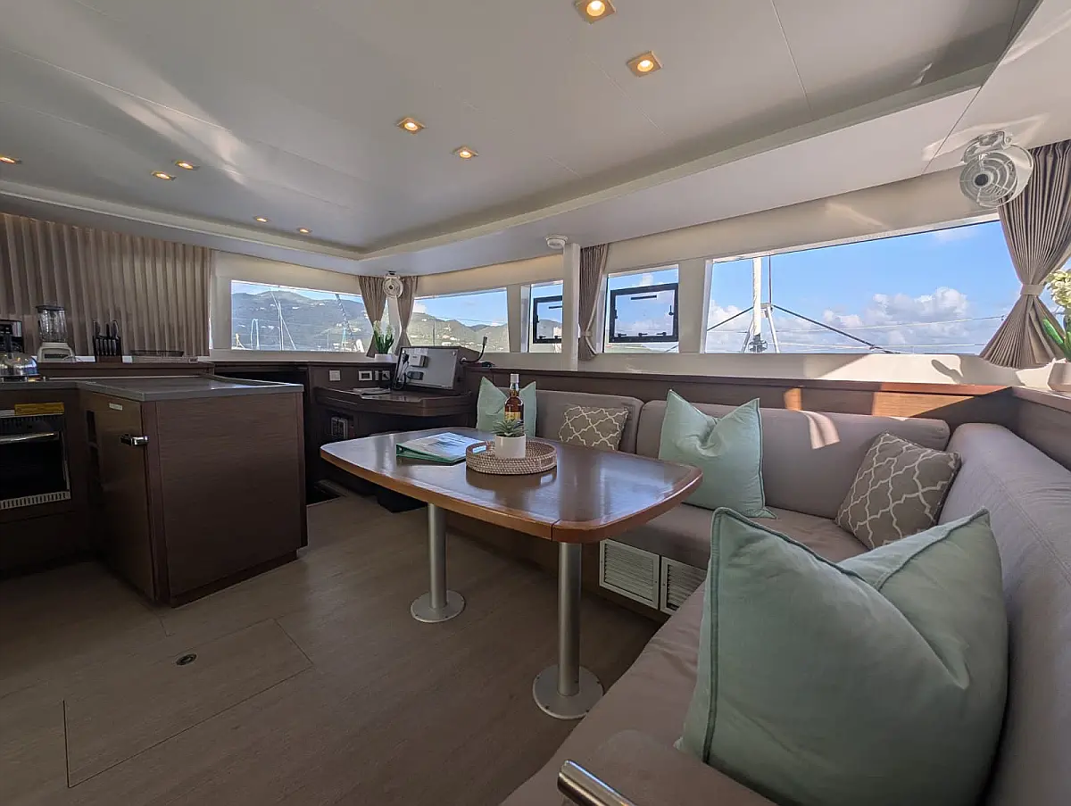 Accommodating up to nine guests comfortably, Bella will exceed your highest expectations for your BVI adventure. The four staterooms with en-suite bathrooms have queen beds, 6'6" headroom and individually controlled air conditioning. The salon is extremely well appointed with a comfy settee and a great indoor dining option. The galley faces the cockpit so the cook will always be part of the action.